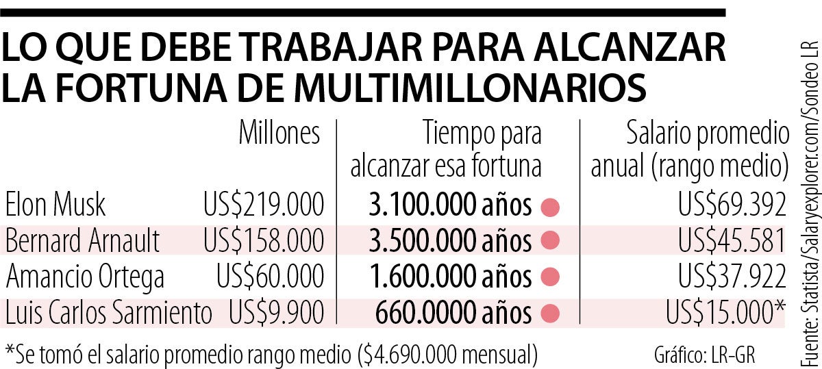 ¿Cuánto debe trabajar un estadounidense para alcanzar la fortuna de Elon Musk (1971)? 3,1 millones de años con un ingreso anual promedio de US$69.392 (Ocde). Si tomamos el salario promedio anual en Colombia, para el rango medio, que según Salaryexplorer.com es de US$15.000, un colombiano debe trabajar más de 660.000 años para tener la fortuna de US$9.900 millones de Luis Carlos Sarmiento (1933). (VP)
