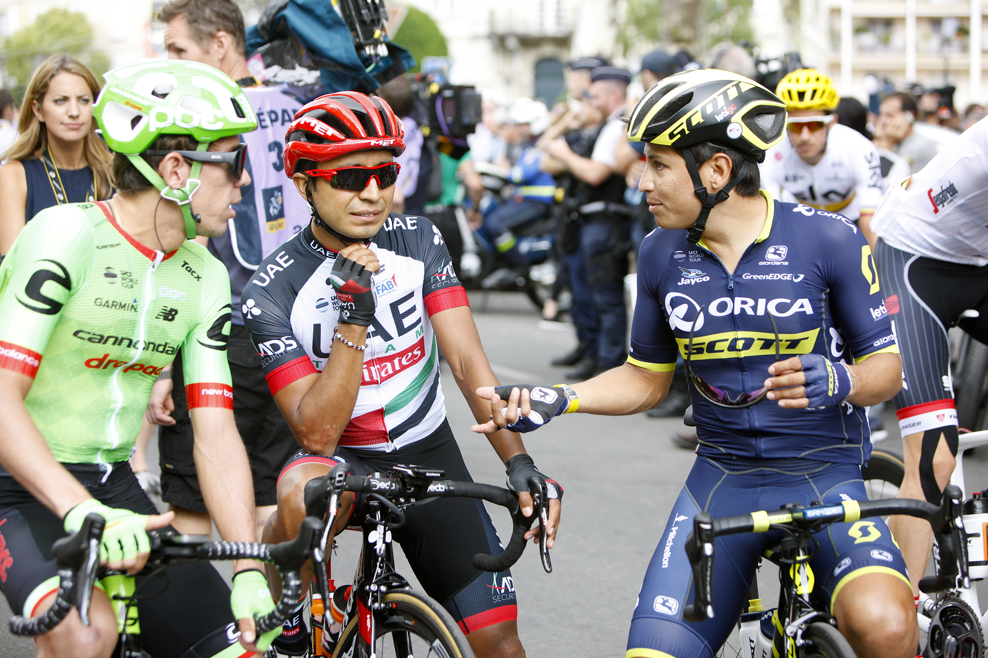 El ciclismo es uno de los deportes que más satisfacción le ha traído a los colombianos en el último tiempo y prueba de ello es la gran cantidad de corredores de élite que hay en el Tour de France. Ayer, en la etapa que ganó Marcel Kittel (1988) hubo tiempo para que tres de ellos, Rigoberto Urán (1987), Darwin Atapuma (1988) y Esteban Chaves (1990) charlaran amistosamente.