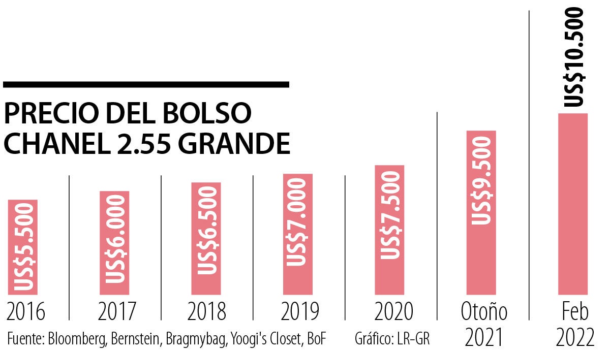 Chanel, al igual que otras marcas de lujo, como Louis Vuitton, empezaron a subir sus precios más frecuentemente y en mayor cantidad en 2021, a medida que las materias primas y la inflación aumentaron a nivel mundial. Según datos recopilados por Business of Fashion, mientras el bolso 2.55 large de Chanel costaba US$7.500 en 2020, en 2021 su precio subió a US$9.500 y en 2022 a US$10.500. (TA)