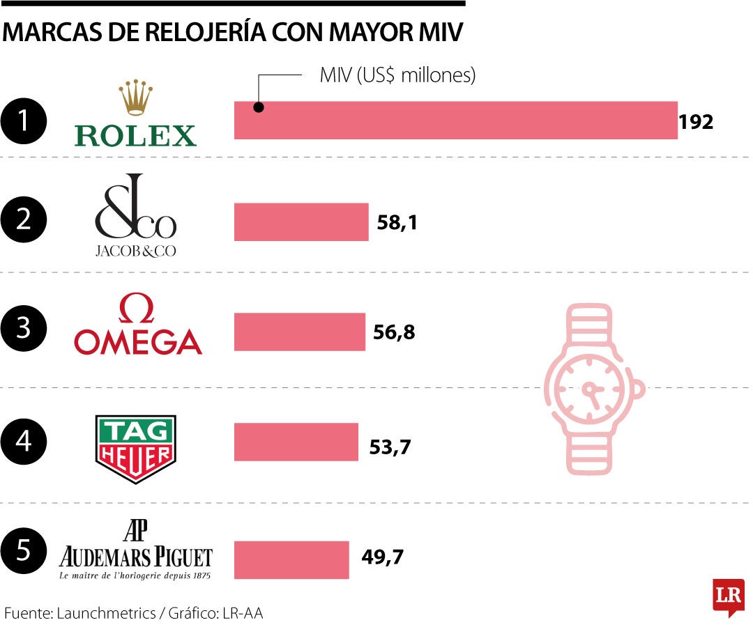 Un reloj Rolex no solo es considerado un símbolo de éxito, también ocupa el primer lugar entre las marcas con mayor impacto mediático, MIV, según la consultora Launchmetrics. Este indicador asigna un valor monetario a las publicaciones para medir el retorno de la inversión del marketing. A Rolex le siguieron Jacob & Co, Omega y Tag Heuer. (TA)