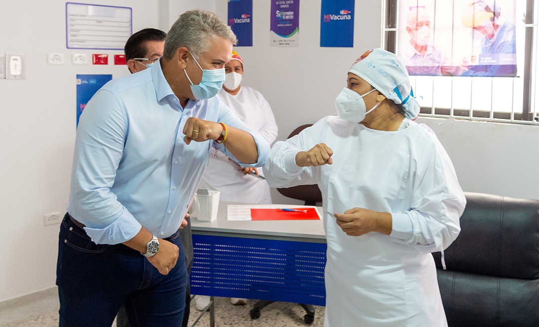 Tras dos meses de haber iniciado la vacunación contra el covid-19 en el mundo, ayer comenzó en Sincelejo (Sucre) la inmunización en Colombia. La primera persona en recibir la vacuna fue Verónica Machado, enfermera jefe de la Unidad de Cuidados Intensivos del Hospital Universitario de esa ciudad. Se le administró el medicamento de Pfizer y el presidente Iván Duque la acompañó en el proceso. (HM) P4-5