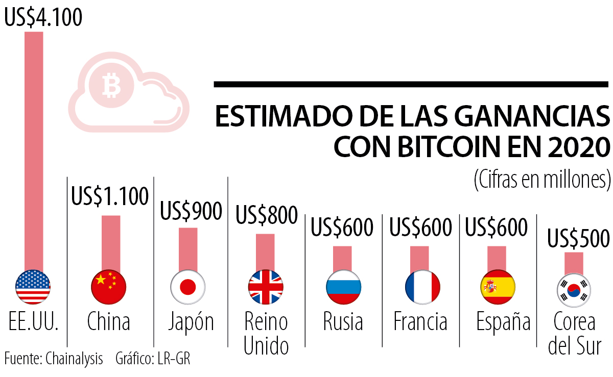 A propósito de que el bitcoin volvió a subir hasta US$50.000, la empresa de software Chainalysis calculó cuánto ganaron los inversionistas con el bitcoin el año pasado. Los estimados hechos ubican a los estadounidenses como los ganadores, con una cifra total de US$4.100 millones; siguen los chinos, con US$1.100 millones, los japoneses con US$900 millones; y los londinenses, con US$800 millones. (VP)