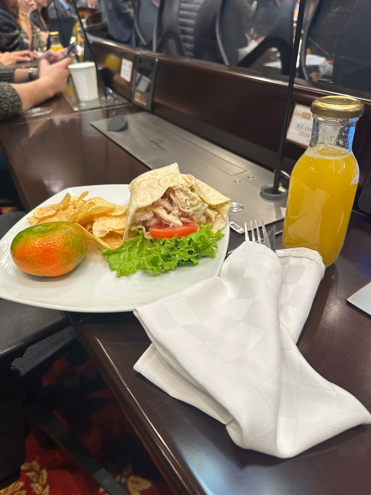 El largo debate sobre el monto del Presupuesto General de la Nación para 2026 obliga a que los parlamentarios de las Comisiones Económicas tengan que almorzar en sus curules. Mientras el Gobierno negociaba bajar $10 billones la cifra, los congresistas degustaban de un wrap de pollo con vegetales, papas chips, jugo de mango y una mandarina. (MMA)