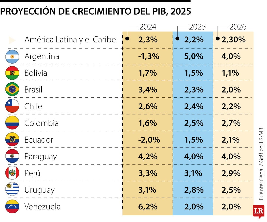 Entre los 33 países que mide la Cepal, Colombia está de 23 por orden de los que más crecerán en 2025, aunque la economía local estaría mejor que el promedio regional