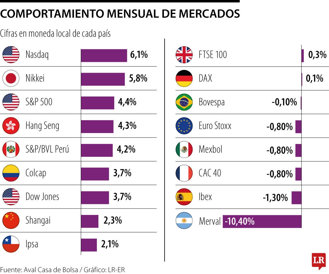 El índice Colcap es uno de los mercados dentro del top 10 de mejor comportamiento y valorización en el mes, y lo que va del año, por debajo de Perú en la región, e Ibex en el mundo