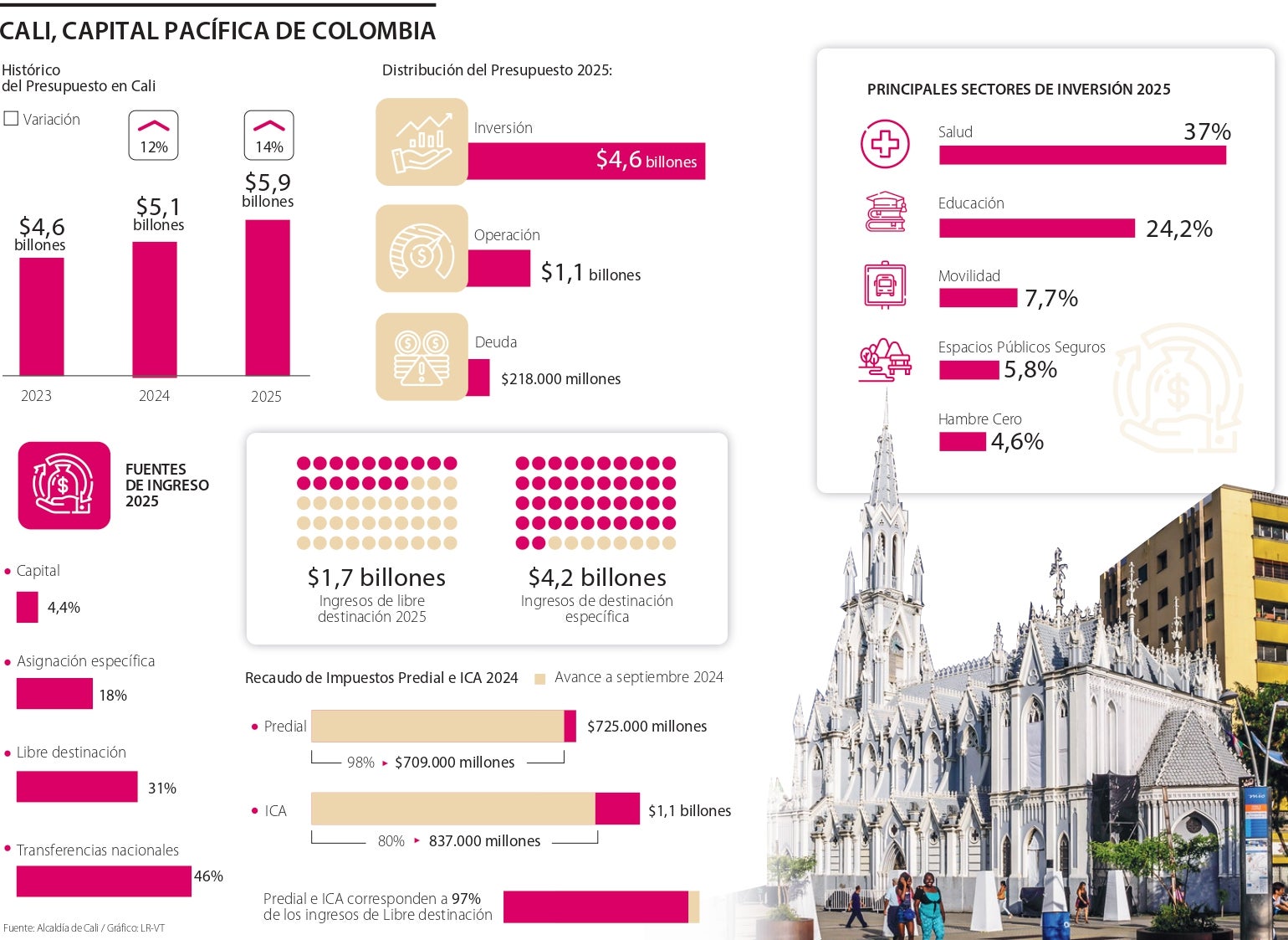 El presupuesto radicado ante el Concejo de Cali para 2025 se proyecta en $5,9 billones, lo que representa un aumento de 14% con respecto al año anterior. De este monto, $4,6 billones están destinados al cumplimiento de las metas del plan de desarrollo ‘Cali, Capital Pacífica de Colombia’, principalmente en temas clave como salud, educación, movilidad, seguridad y programas de asistencia social; $1,1 billones para funcionamiento, y $218.000 millones para el servicio de la deuda.