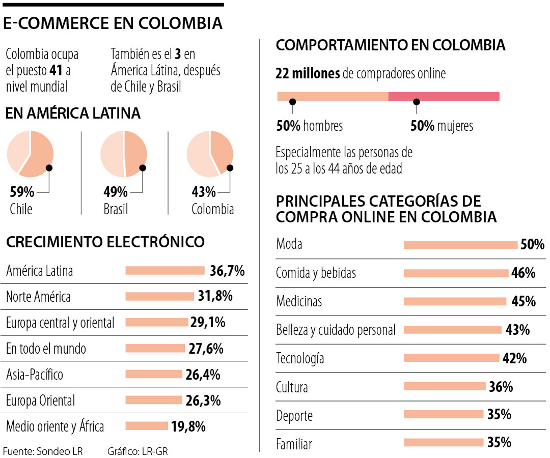 De acuerdo con Andrés Escobar, director de ExistaYa y Marketing University, Colombia ocupa el puesto 41 entre los países con mayor penetración de E-commerce en el mundo, y el tercer lugar a nivel de América Latina, tras alcanzar una cifra representativa del 43% en 2020, por debajo de Chile y Brasil quienes sumaron alrededor del 59% y 49%, respectivamente.