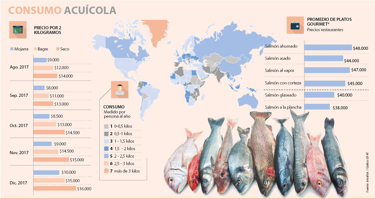 El kilo de este tipo de salmón, por ejemplo, inicia en $23.600. Mientras que el chileno está en promedios de $26.400 y el de mayor prestigio por sabor es el noruego a $32.000 por kilo. Además, las presentaciones ahumadas, al vapor y glaseados, requieren de filetes chilenos o noruegos.