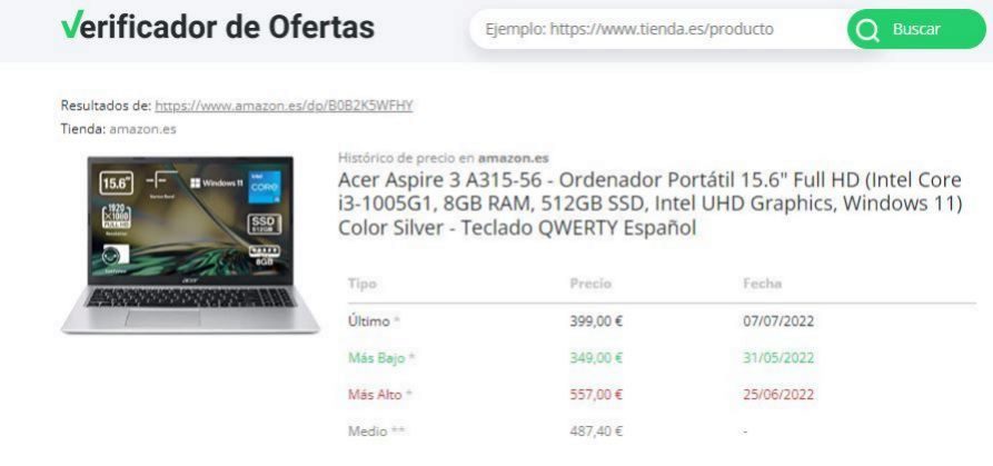 Poniendo por ejemplo el ordenador portátil Acer Aspire 3 A315-56 que según Amazon ya tiene una oferta por el Prime Day anticipada del 24%, vemos que ha bajado mucho su precio desde el 25 de junio, que estaba a 557 euros, pero en mayo se vendía más barato que actualmente con la oferta, a 349 euros.