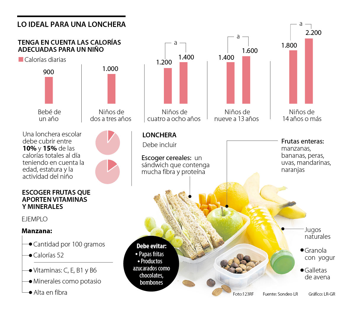 De acuerdo con Sandra Pérez Paniagua, nutricionista-dietista, una lonchera escolar debe cubrir entre 10% y 15% de las calorías totales al día, teniendo en cuenta la edad, estatura y la actividad que realice el menor.