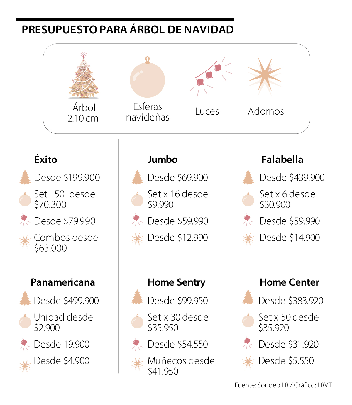 En un sondeo realizado por LR se compararon los precios, entre siete canales de retailers del país, para conocer a cuánto puede ascender el presupuesto del árbol. Vale la pena aclarar que este ejercicio tuvo cómo punto de partida la referencia de un árbol de navideño de 2,10 metros de alto. Almacenes como Éxito ofrecen en su página web una variedad de árboles (en descuento) que van desde $199.900 hasta $943.800. En materia de diseños se destacan los clásicos pinos, hasta árboles de color blanco y con luces incluidas.