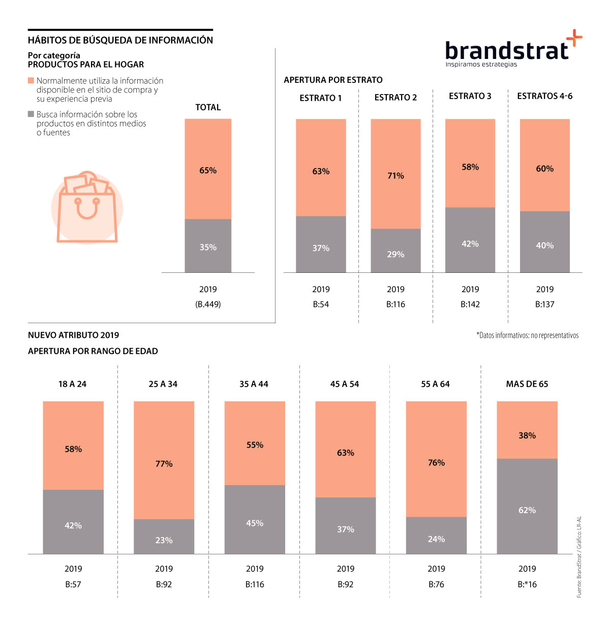 Los estratos más bajos son los que normalmente utilizan mayor información de un producto en el mismo punto de venta o a través de experiencias previas. En concreto, el estrato 2 es en el que más se utiliza según BrandStrat debido a que sus recursos económicos son limitados y prefieren realizar compras seguras tanto en calidad, cantidad y dinero. Esto, según la consultora, puede darse a los diferentes cambios económicos como la reforma tributaria, el desempleo, la inflación, entre otros aspectos que afectan la economía.