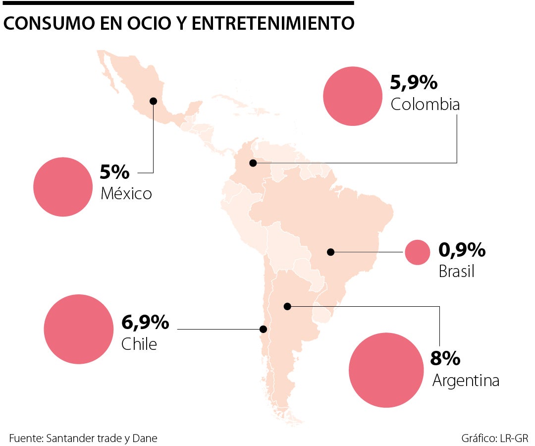 Según un estudio realizado por la firma Raddar, los hogares colombianos gastan su dinero principalmente en comida (que ha sido fuertemente afectada por la inflación), vivienda y entretenimiento. Esta última ocupa 5.9% del salario mínimo legal en Colombia, lo que corresponde a $68.440 cada mes, cuando se tiene en cuenta que el salario es de $1,16 millones. Según reportes del Dane, este fue uno de los sectores qué más le aportó al PIB nacional.
