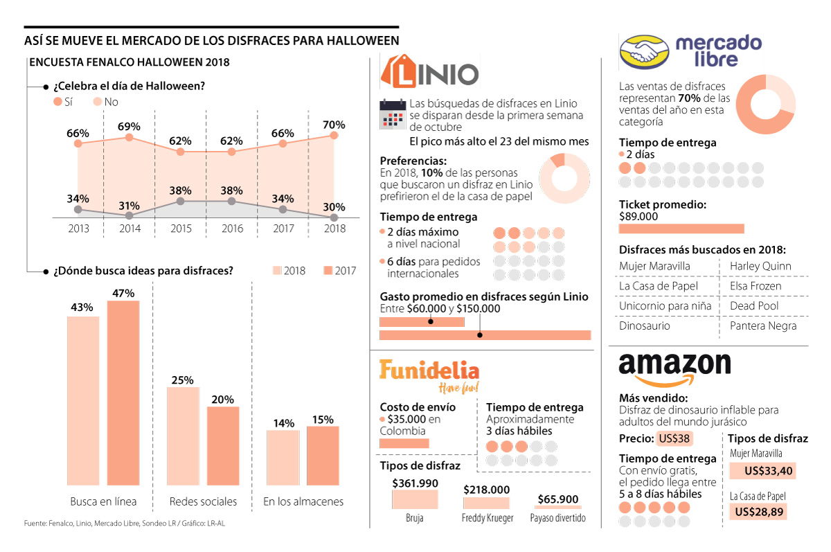 Precisamente, según una encuesta realizada por Fenalco en octubre del año pasado, en las principales ciudades del país, 43% de los colombianos buscaron sus ideas de disfraces en línea y 25% a través de redes sociales.