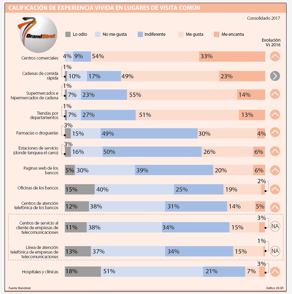 Según una encuesta realizada por la consultora BrandStrat, las líneas de atención y puntos de servicio al cliente de empresas de telecomunicaciones solamente superaron a los hospitales en cuanto a experiencia vivida en el lugar. Tanto los centros de servicio, como las líneas telefónicas tuvieron menos de 20% de percepciones positivas. Sin embargo, los estratos 4, 5 y 6 mostraron índices cercanos a 50% de indiferencia.