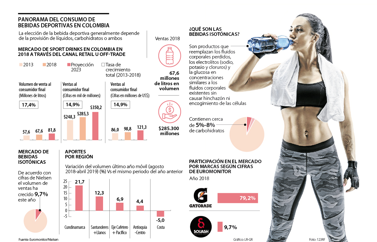 Según cifras de Euromonitor, durante el año pasado, la categoría de sport drinks (bebidas deportivas) en Colombia vendió $285.300 millones y se consumieron 67,6 millones de litros. La tasa de crecimiento total para esta categoría en términos de volumen en el período 2013-2018 fue de 17,4%.