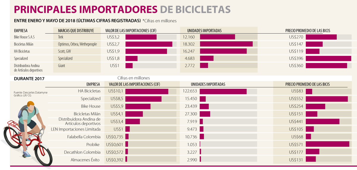 Los números que permitieron que estas marcas se llevaran la corona fueron importaciones registradas por valores de US$3,2 millones, al traer 12.160 unidades de la marca Trek en lo que respecta a Bike House; en segundo lugar está Milán, con un valor total de US$2,7 millones, con 18.302 referencias de bicis entre Optimos, Orbea y Wethepeople; y por último, HA Bicicletas facturó US$1,9 millones, con 16.247 unidades de las marcas Scott y GW.