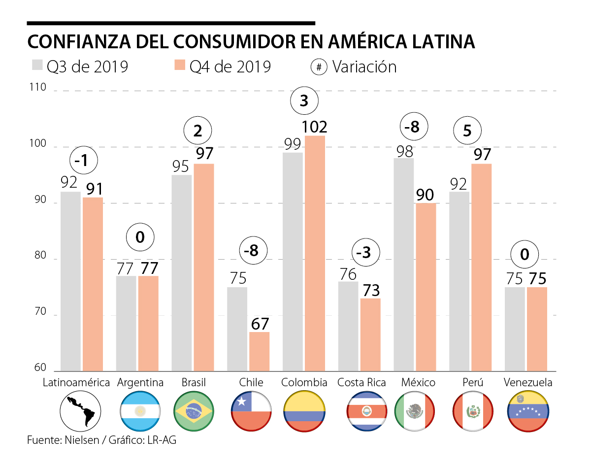 En los países de la región donde se presentó la mayor contracción del índice de confianza de los consumidores fue en Chile con -8%, México con -8% y Costa Rica con -3%. La situación de Chile se explica en que este país estuvo inmerso en un contexto de protestas antigubernamentales, aseguró la empresa estadounidense.