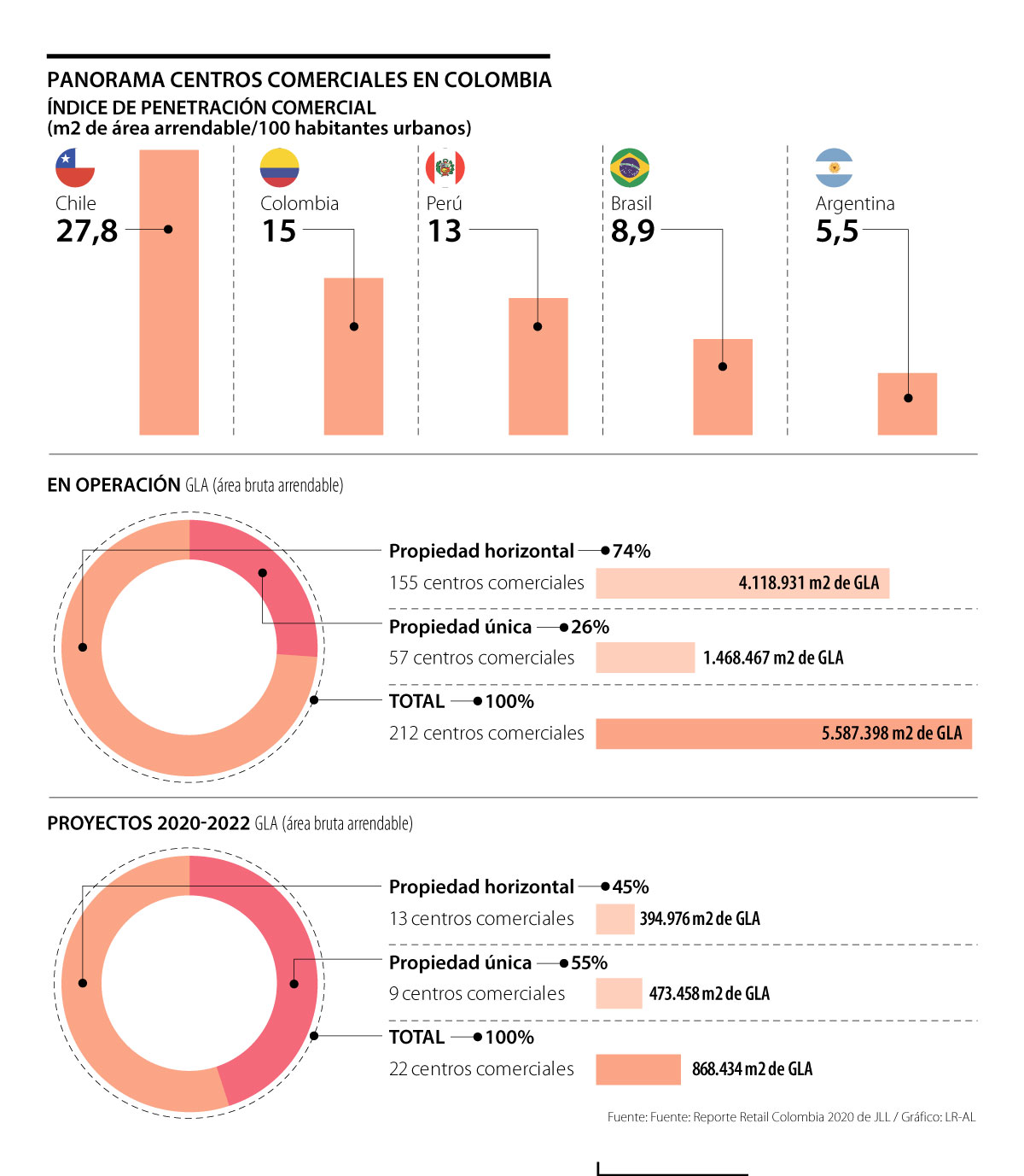 Por otra parte, el estudio destaca que “tradicionalmente el desarrollo de centros comerciales en Colombia se ha dado bajo la estructura de propiedad horizontal. Los proyectos son promovidos bajo esquemas de preventa y una vez alcanzado el punto de equilibrio se da inicio a la etapa de construcción de esta forma se logra mitigar el riesgo asociado a la inversión y al proceso de comercialización de espacios”.