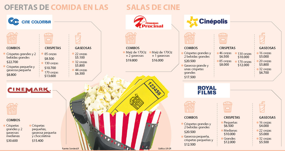 Si usted quiere invitar a sus amigos, pareja o familiares a cine tenga en cuenta el siguiente sondeo que hizo LR con los principales cinemas en Bogotá sobre el precio del combo básico de gaseosa y palomitas.
