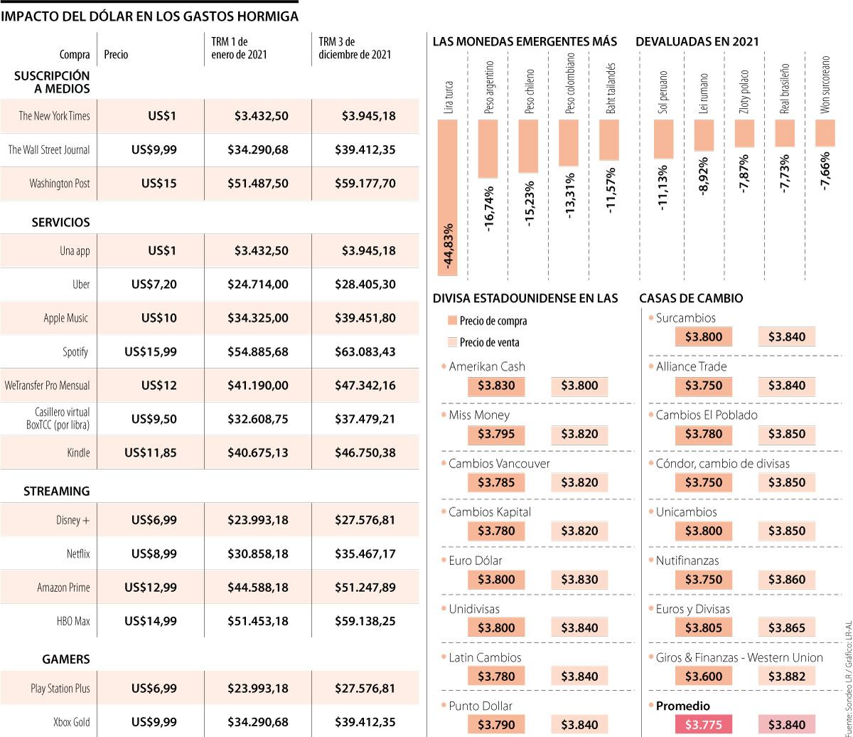 Entre los productos que los colombianos han visto encarecerse y que quizás mantendrán un alto costo hasta el próximo año, se encuentran la suscripción a medios internacionales como The New York Times, la cual tiene un costo mensual de US$1. Una membresía de The Wall Street Journal, que tiene un precio estándar de US$9,99 mensuales, pasó de representar $34.290 a inicios de 2021 a $39.412,35 ayer.