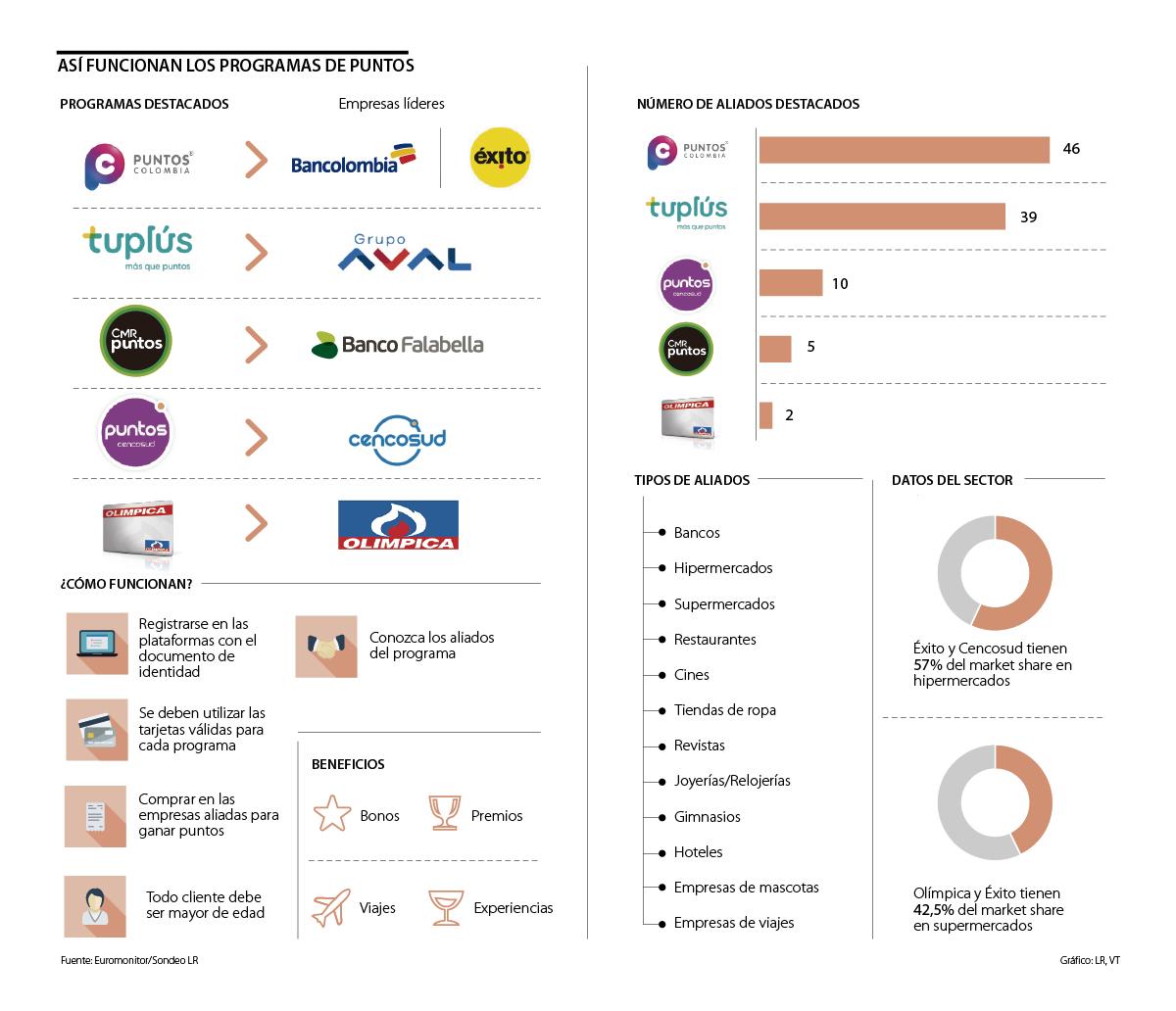 Las empresas promotoras de los programas de puntos también se han caracterizado por ser relevantes dentro del negocio de hipermercados y supermercados. Según datos de Euromonitor International, Éxito y Cencosud se llevan alrededor de 57% del market share, mientras que en el segundo negocio, son Olímpica y Éxito quienes tienen 42,5% de la participación de mercado. De acuerdo con los datos del proveedor de investigación, los hipermercados cuentan con un espacio superior a 2.500 metros cuadrados.