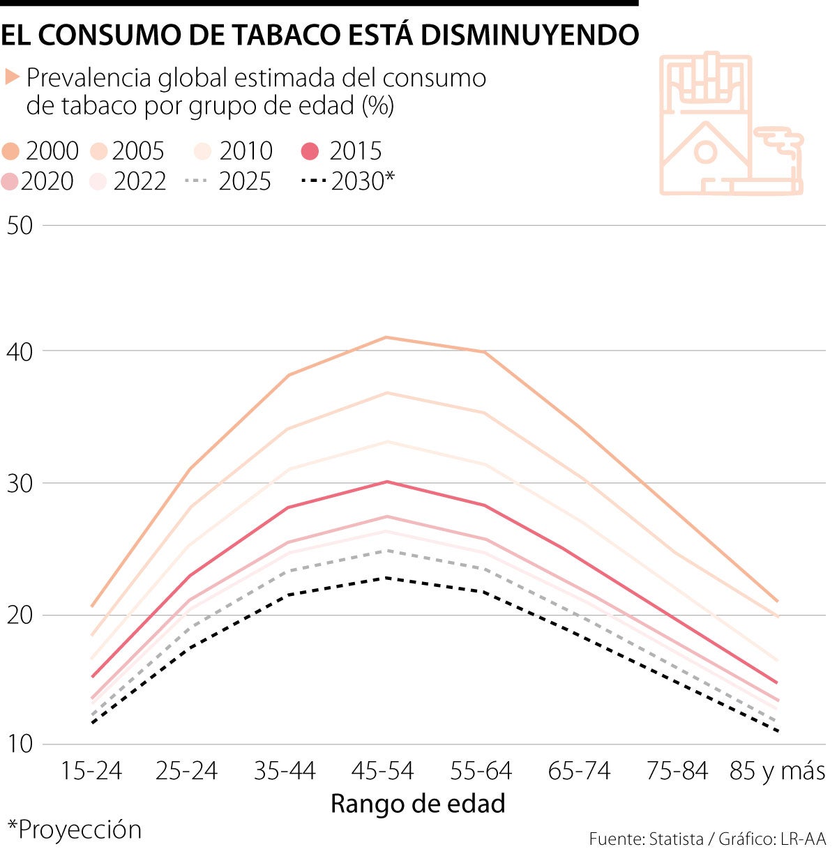Se debe tener en cuenta que su consumo varía en relación con el género y la edad. En 2020, 35,5% de los hombres en el mundo tenía el hábito de fumar, una proporción que se reducirá ligeramente a 32,9% en 2025. Para el caso de las mujeres, el dato es mucho menor: en el año de la pandemia se encontró que 7,9% de ellas tenía adicción al tabaco, mientras que para 2025 se reducirá a 6,7%. El consumo se concentra en un grupo de edad de entre 45 y 54 años.