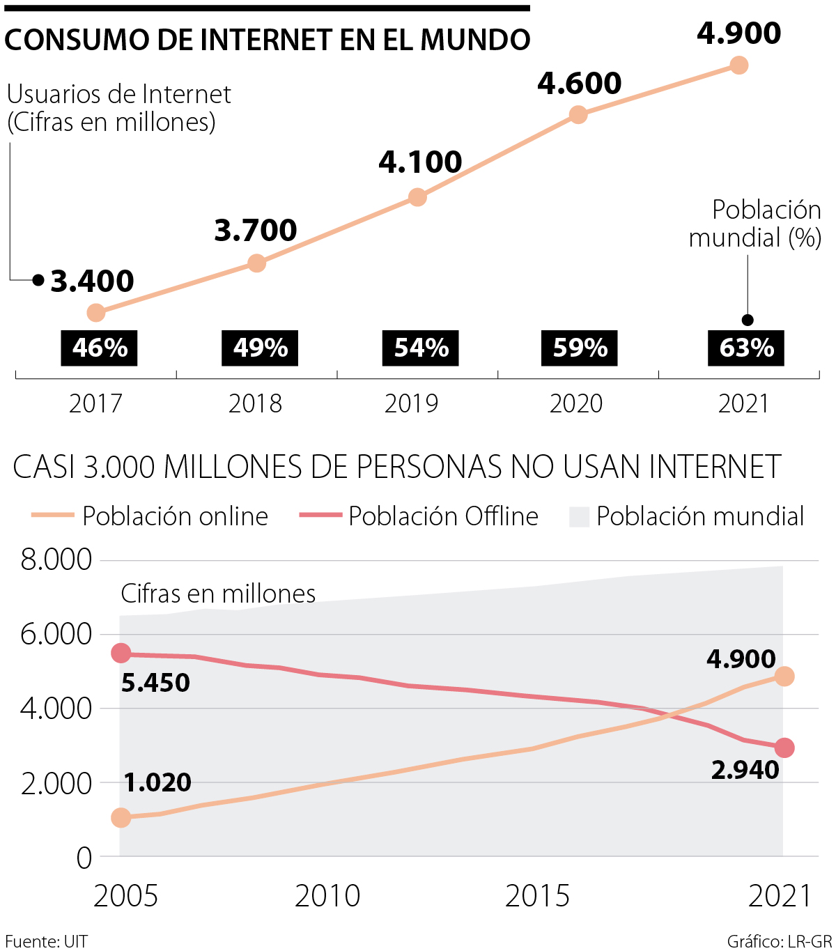 La población conectada llegó a 63%, es decir, 4.900 millones de personas en 2021 frente a los 4.100 millones qué había en 2019