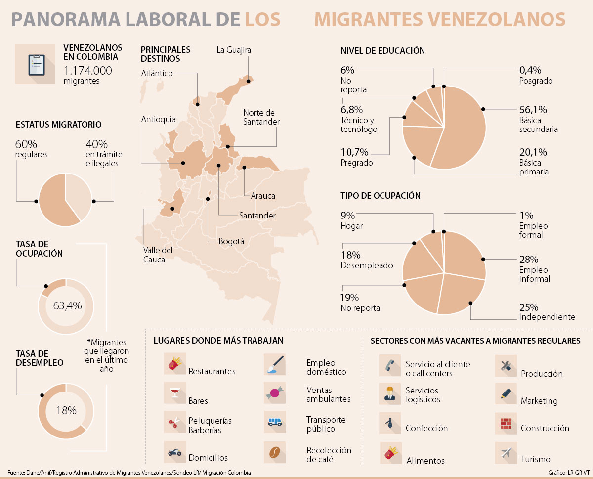 Estos sectores de servicio y consumo son en los que más se aprecia el impacto de la llegada de migrantes de Venezuela, junto con las ventas ambulantes en vehículos de transporte público de todo el país. Sin embargo, y a pesar de los esfuerzos que realizan entidades como el Ministerio de Trabajo en pro de un mayor control con la creación del Registro Único de Trabajadores Extranjeros en Colombia (Rutec), la tasa de desempleo para los venezolanos que han llegado en el último año se ubica en 18%, casi duplicando al promedio nacional.