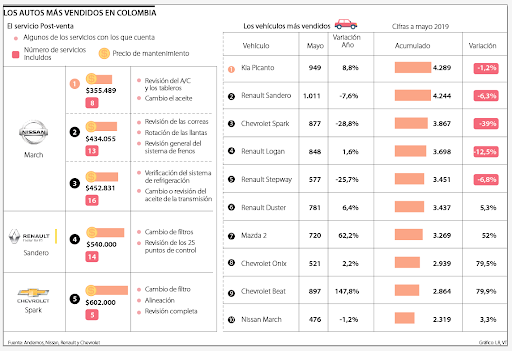 De acuerdo con el informe de ventas de vehículos de la Asociación Nacional de Movilidad Sostenible (Andemos), durante los cinco primeros meses del años las marcas Renault, Chevrolet y Nissan fueron las grandes vendedoras de autos en el país. Las tres ofrecen a sus clientes servicios de mantenimiento posventa para incentivar su fidelidad.