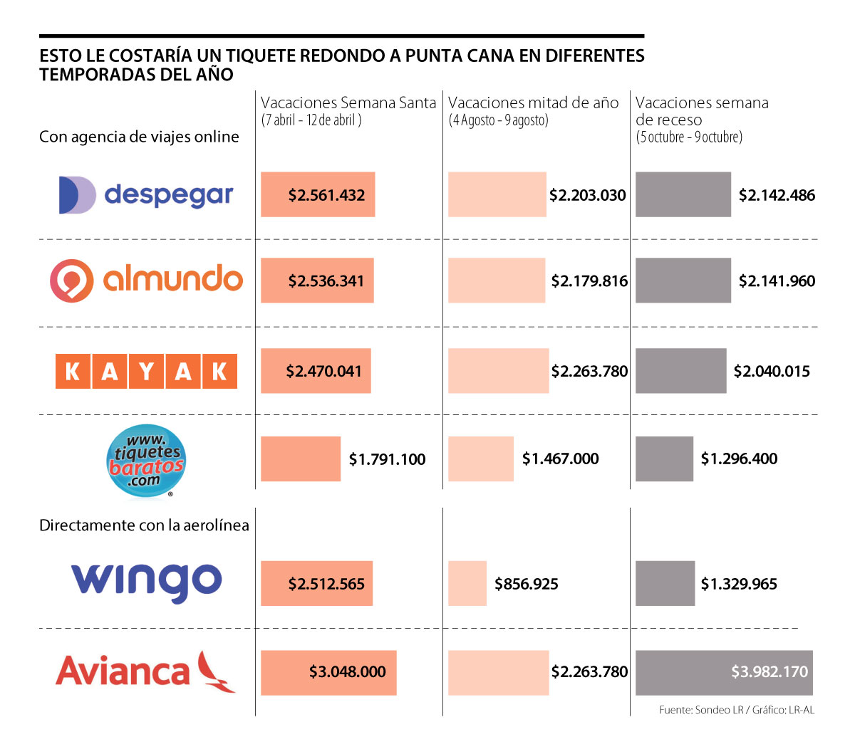 Un sondeo de LR que tomó como destino Punta Cana, República Dominicana, por ser uno de los destinos con más turistas y además al que aerolíneas colombianas como Wingo y Avianca cuentan con vuelos directos, se propuso analizar cuáles son los precios más bajos en temporada alta.