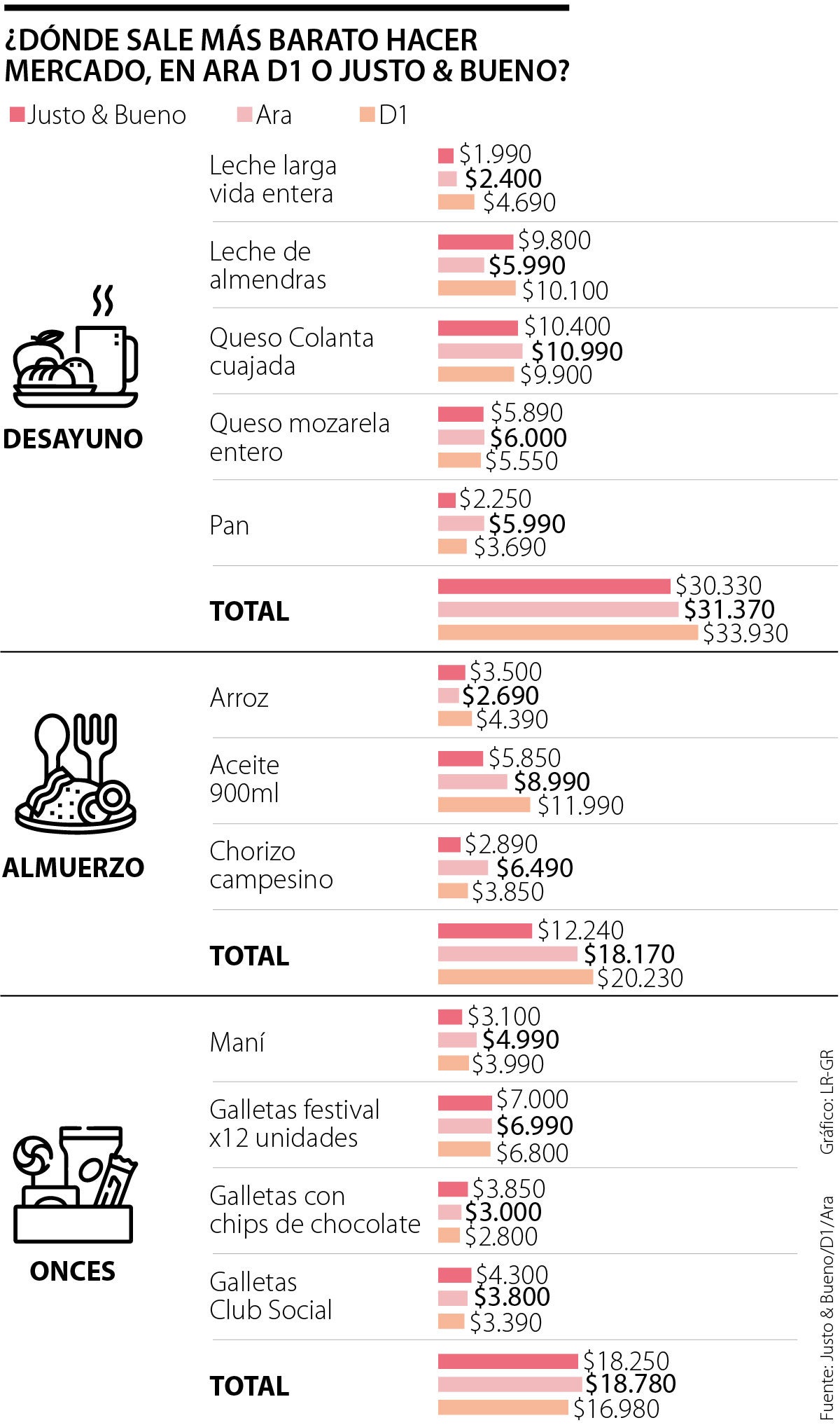 LR realizó un sondeo por los precios de los productos más esenciales a la hora de hacer un desayuno, un almuerzo o picar algo antes de la cena. Este sondeo reveló que, en general, mercar en Justo y Bueno es más barato que en Ara o en D1. Esto, en parte, porque en medio de su liquidación, en las pocas tiendas que quedan, todo está mucho más barato.