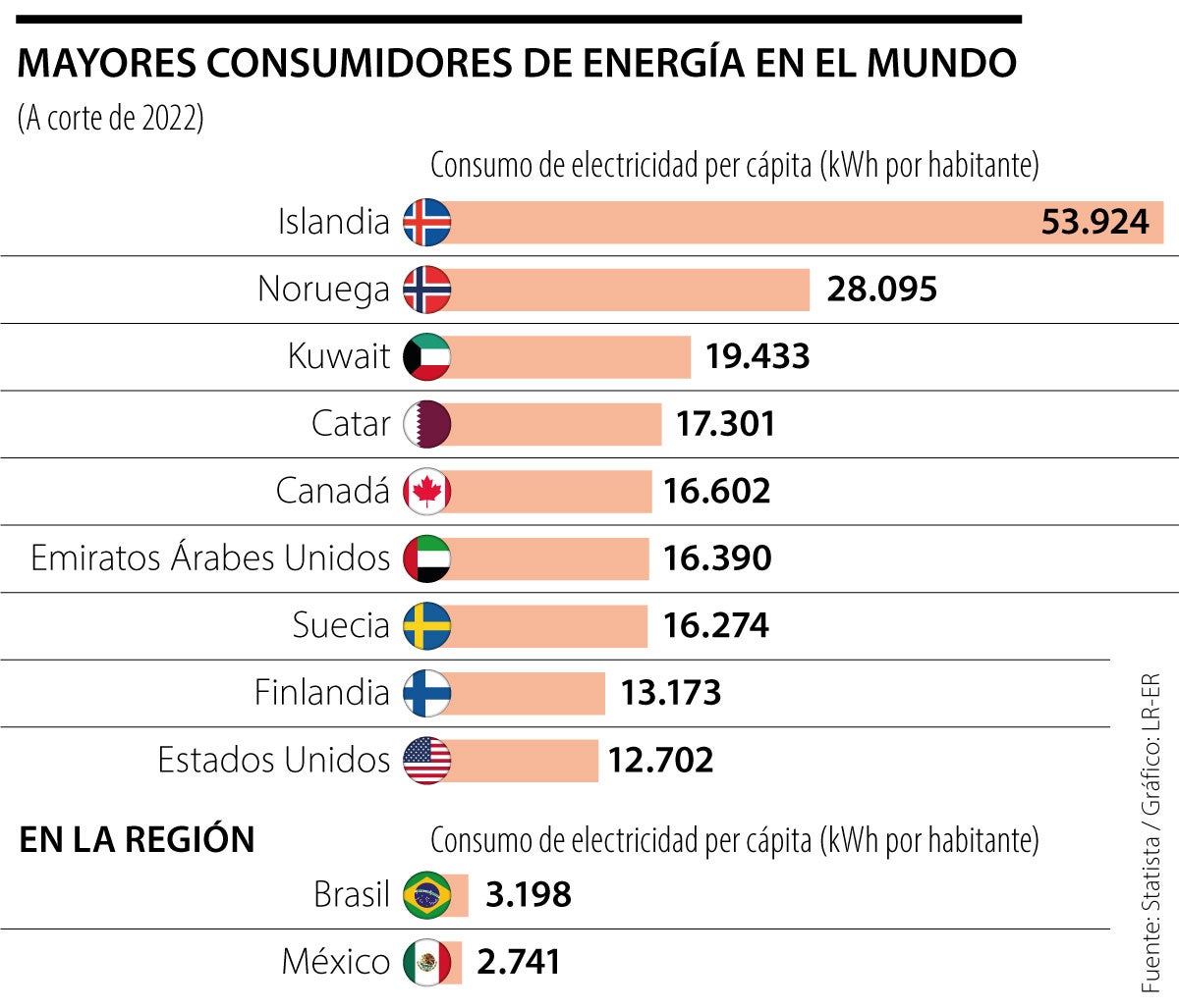 El primero en el listado consume 1.500% más que el que lidera demanda en América Latina, con cerca de 53.924 kWh per cápita