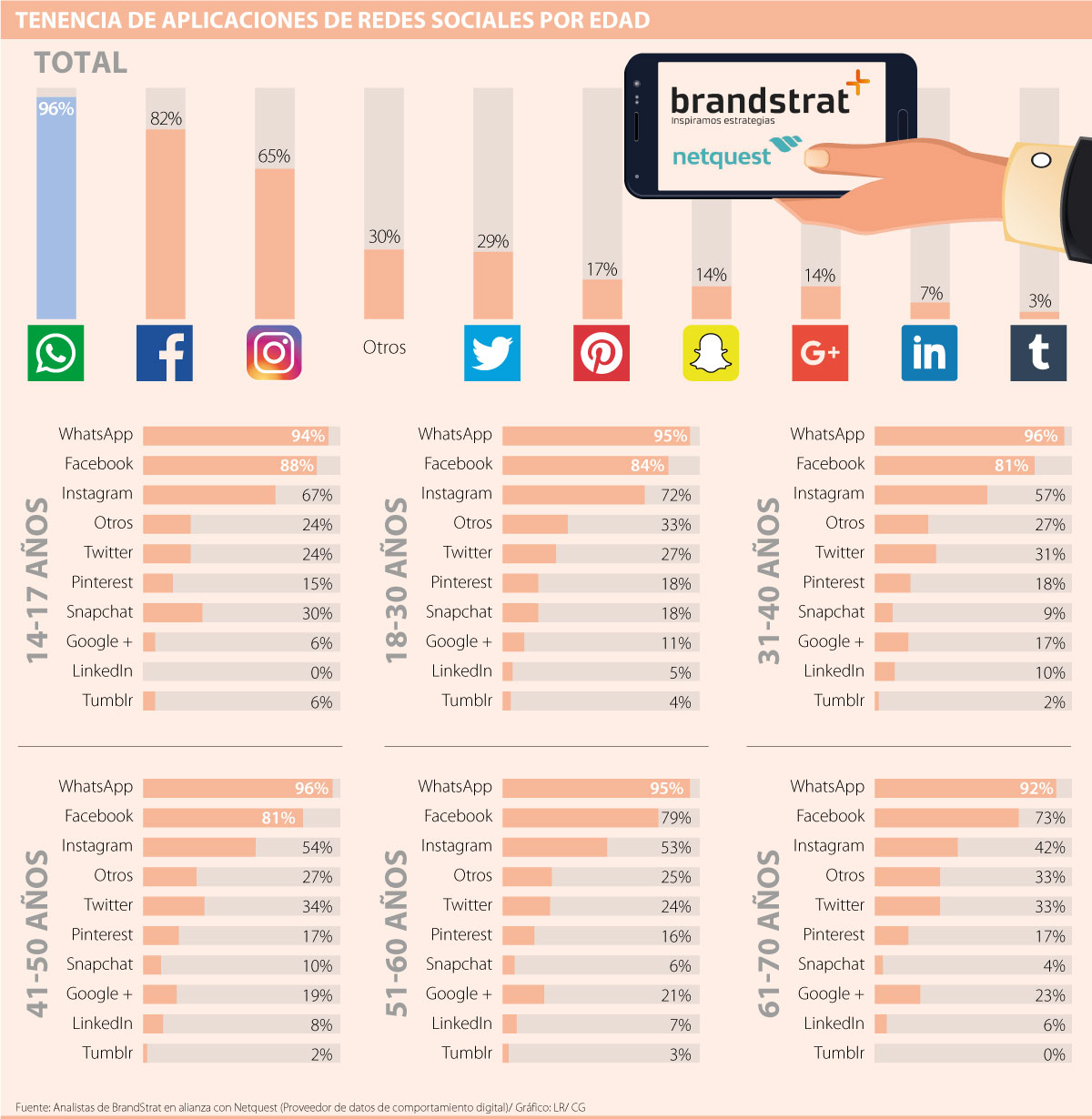 De acuerdo con el análisis realizado por BrandStrat, “el alto nivel de incidencia y uso de Whatsapp y Facebook es transversal a los diferentes grupos de edad y estratos, convirtiéndose en herramientas de comunicación e información vitales para toda la población de las principales ciudades del país. Los paquetes y promociones de los operadores celulares que ofrecen gratis acceso a estas dos aplicaciones puede haber influido de forma importante”.