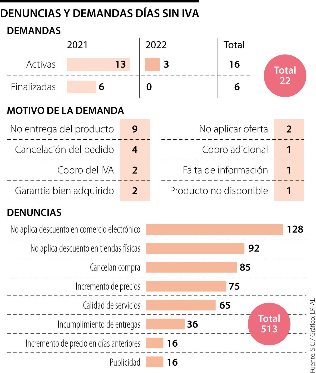 Las Delegatura de Asuntos Jurisdiccionales de la SIC dio a conocer que a su competencia llegaron 22 demandas en contra de distintos comercios por acciones cometidas en las jornadas sin IVA del año pasado. Al desagregar, se evidencia que nueve fueron por la no entrega de un producto comprado durante esos días y cuatro fueron por una cancelación del pedido. A su vez, con dos demandas cada una, se encuentran las categorías de haber cobrado el IVA pese a la suspensión del impuesto, por la garantía de un bien adquirido y por no haber aplicado la oferta presentada.