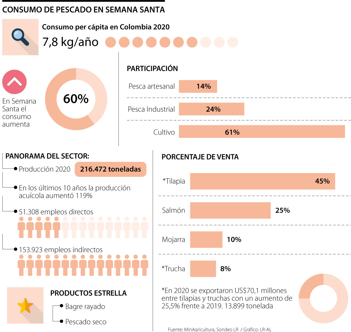 Con el tiempo, y pese a que el pescado cambió su connotación, el consumo en Semana Santa siguió vigente favoreciendo a los acuicultores y comercializadores del producto que en promedio, según cifras del Ministerio de Agricultura, presentan incrementos de hasta 60% en las ventas.