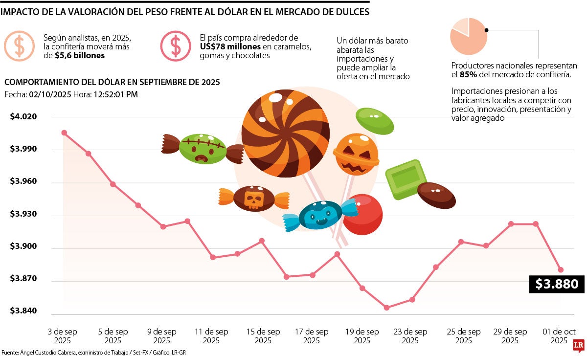 Según lo reveló Ángel Custodio Cabrera, exministro de Trabajo, en 2025 el mercado de la confitería está proyectado en cerca de $5,6 billones. Adicionalmente, indicó que con un dólar más barato habrá un alivio para las compras en el exterior, ya que abarata en pesos cerca de US$78 millones que el país adquiere en productos como gomas, chocolates y caramelos.