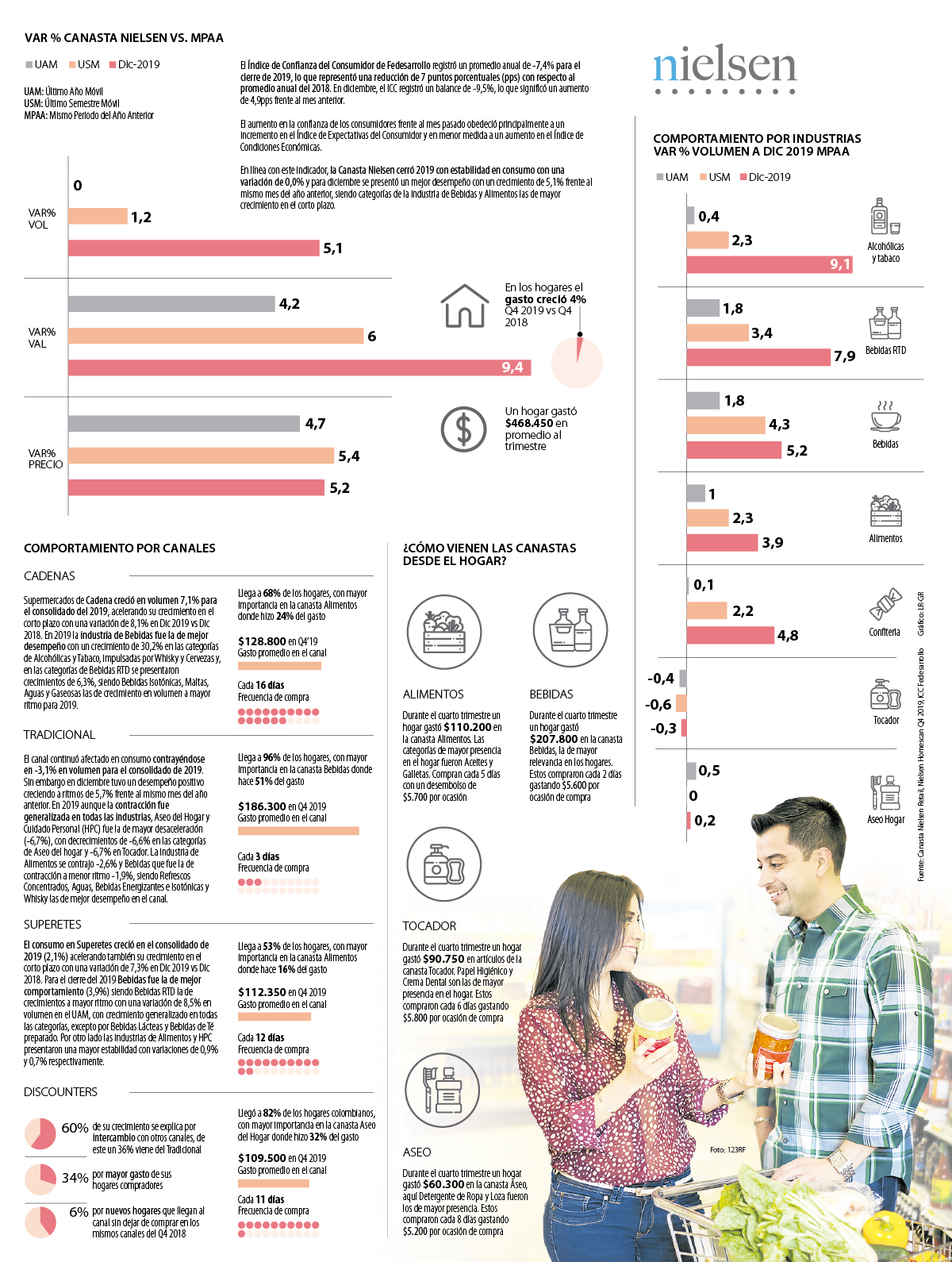 De acuerdo con el más reciente análisis de Nielsen Trends, el gasto de los hogares colombianos aumentó 4% en el cuarto trimestre del año pasado en comparación con el mismo periodo de 2018. A pesar de el incremento en el gasto, no hubo una subida en el consumo, ya que se presentó una variación de 0% en la canasta Nielsen. En diciembre, sin embargo, se presentó una tendencia positiva, con un aumento del consumo de 5% frente a 2018.