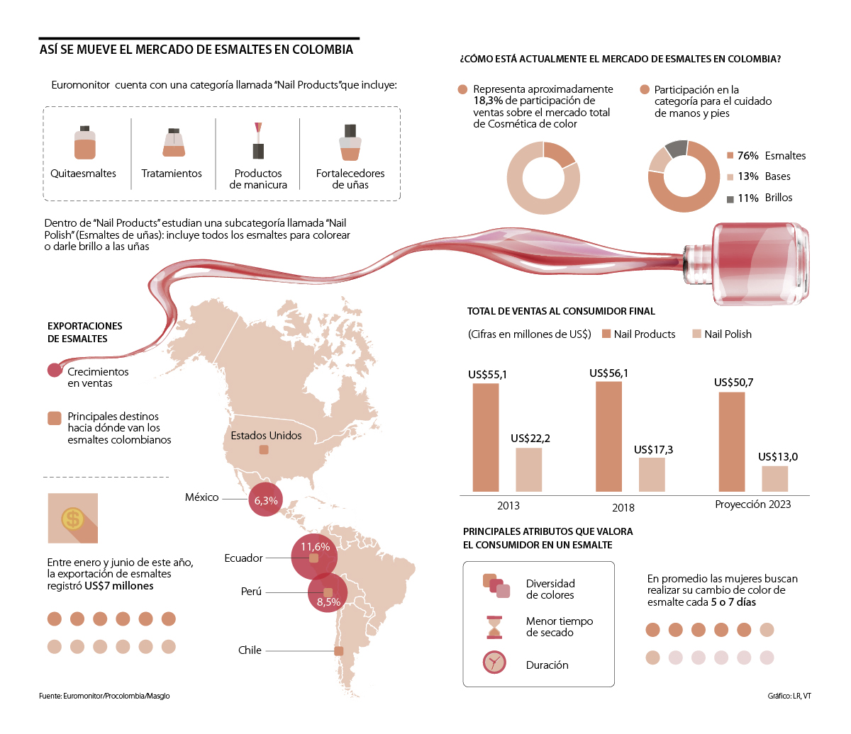 Según cifras de Euromonitor las ventas de esmaltes en el país llegaron a US$17,3 millones durante el año pasado, mientras que las ventas de productos para uñas alcanzaron US$56,1 millones.