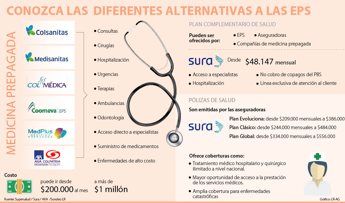 Sin embargo, ninguna de estas tres opciones adicionales al POS le ofrece ni las mismas coberturas ni prevé los mismos costos. Los más accesibles son los planes complementarios de salud, que se pueden encontrar desde $30.000 y $40.000 a más de $100.000. Por su parte, la prepagada y las pólizas de salud puede ir, en función de las coberturas del usuario, desde unos $200.000 mensuales o, incluso, menos.