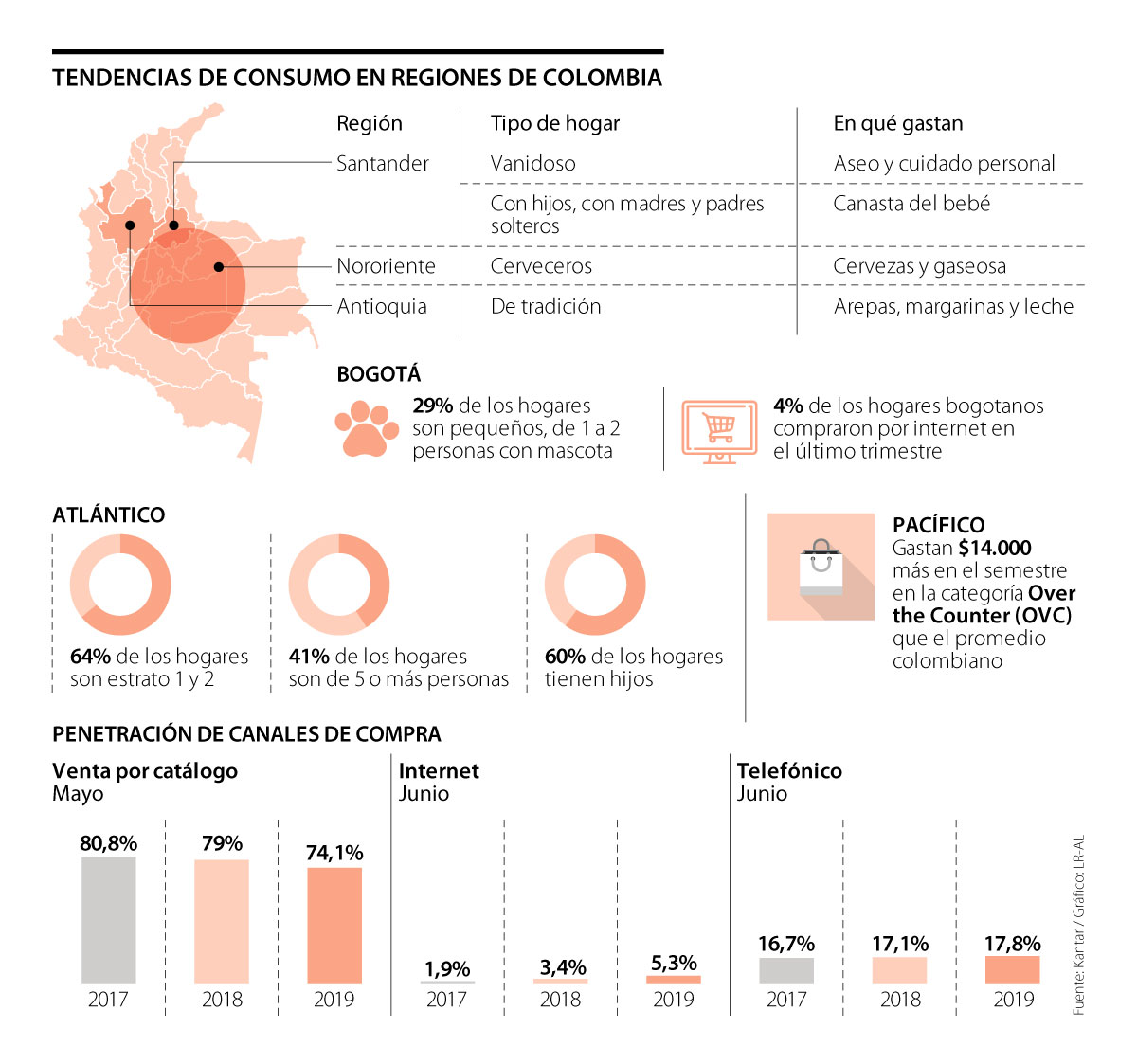 La compra de productos de consumo masivo online es pequeña, pero está en aumento y Bogotá es la región más importante para este canal. El tiquete promedio es de $68.600, con una frecuencia de compra de tres veces al año. El domicilio es un canal muy utilizado en la región Atlántico, con una frecuencia de compra de cada 15 días y un tiquete promedio de $6.305. La venta ambulante es fuerte en la región Oriente. Mientras tres de cada 10 colombianos compran en ambulantes, en esta zona cinco de cada 10 lo hacen. La compra es mensual.
