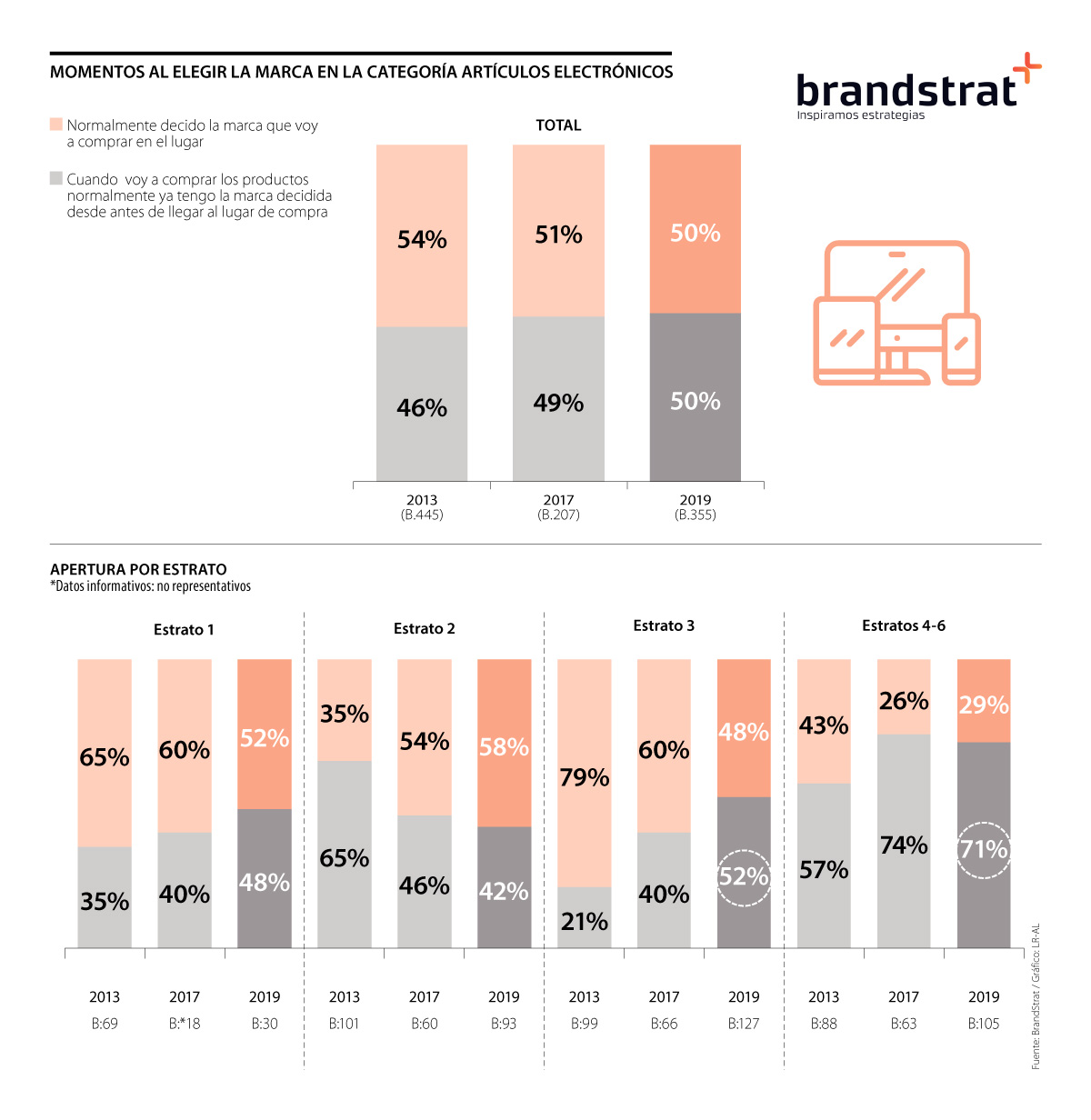 A pesar del auge del comercio online, las tiendas físicas son fundamentales en la comercialización de artículos electrónicos, sobre todo para los compradores de los estratos más bajos, ya que en el momento que están en la tienda se decantan por una marca. Entre las personas de estratos más altos, la decisión de marca ya viene consolidada cuando entran al punto de venta. Esas son las dos grandes conclusiones del más reciente estudio de la consultora BrandStrat.