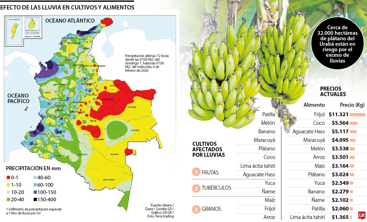 Cultivos de ciclo corto como patilla, melón, maracuyá, plátano, ñame y yuca serán los más afectados por las precipitaciones, lo que provocará un alza de los precios
