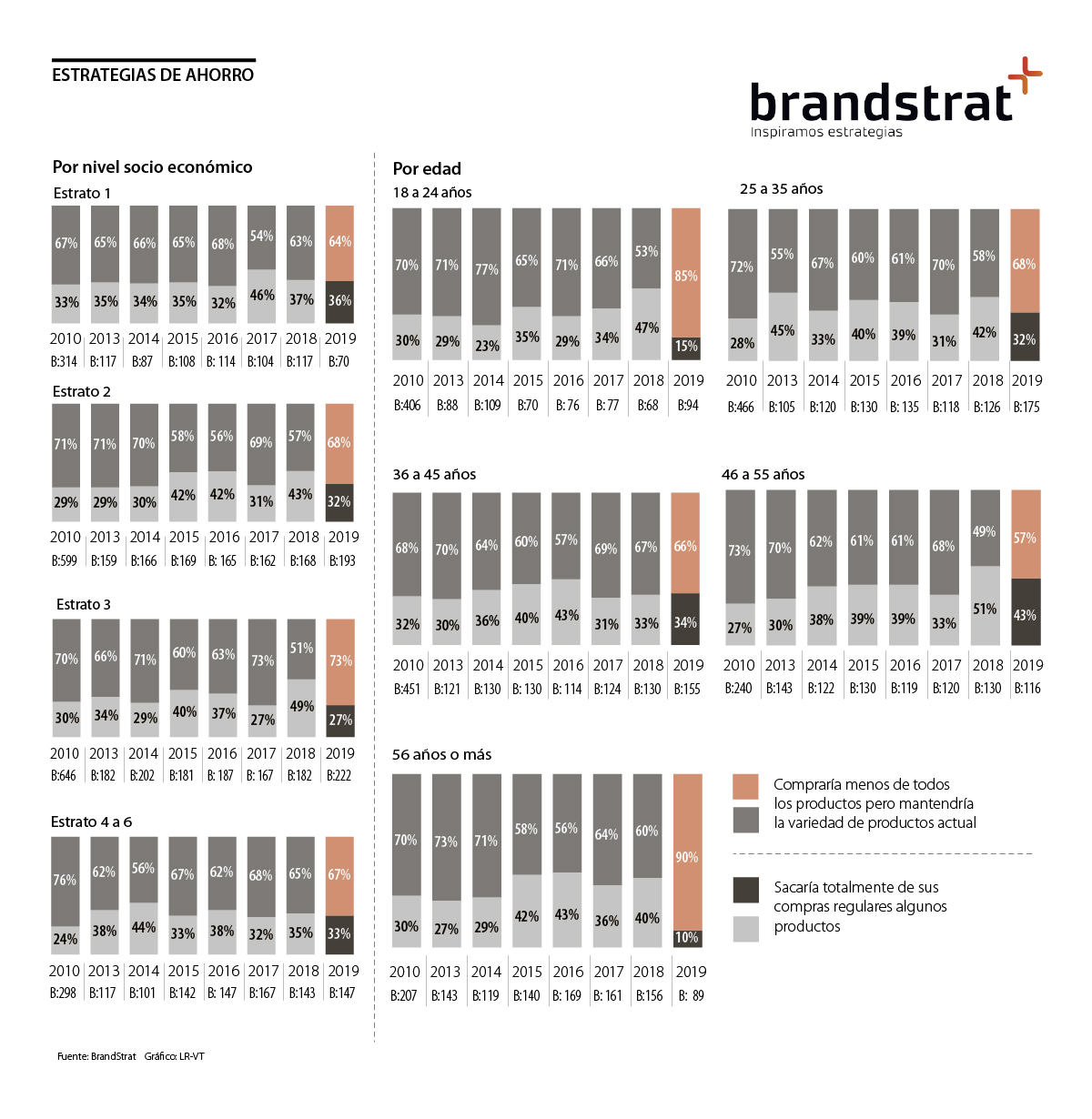 En este también se muestra que la preferencia de los jóvenes de entre 18 y 24 años se repite entre quienes tienen de 56 años en adelante, pues 90% de las personas dijo que a la hora de ahorrar no prescindiría de las marcas, sino que disminuiría la cantidad de los artículos comprados; frente a 10% que prefiere sacar de su mercado regular algunos de los ítems. De acuerdo con la consultora, esto puede estar motivado por “ser los decisores/cabeza de hogar, convirtiéndose en los encargados de mantener estabilidad en el consumo de los miembros de la familia”.