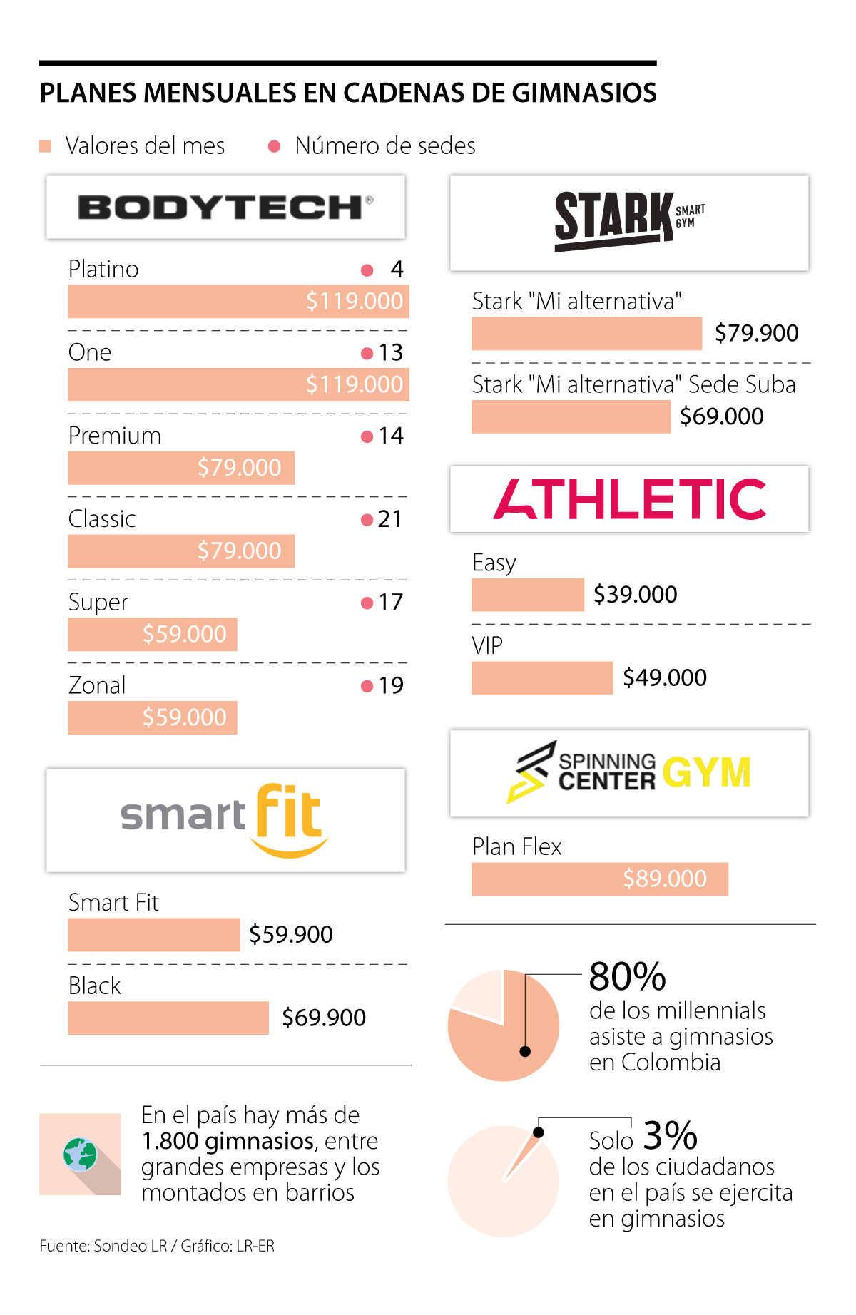 De acuerdo con cifras de Fitpal, la aplicación que le permite a sus usuarios asistir a varios gimnasios pagando una única suscripción, un plan mensual en un estudio boutique fitness en Bogotá cuesta en promedio $289.000.