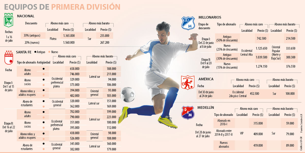 Hasta la fecha, 10 de los 20 equipos que participan en la primera división del fútbol colombiano han revelado sus ofertas para abonos en la boletería del segundo semestre del año: Atlético Nacional, América de Cali, Millonarios, Santa Fe, Independiente Medellín, Deportivo Cali, Junior, Alianza Petrolera, Once Caldas y el vigente campeón, Deportes Tolima.