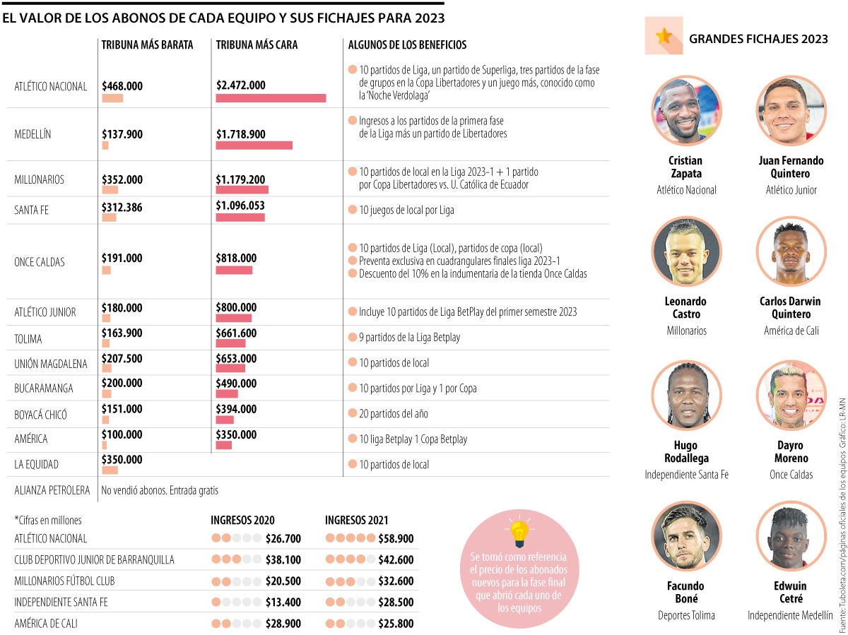 Los precios que encontraron los aficionados al fútbol colombiano fueron desde el ingreso gratis al estadio hasta abonos que sobrepasaban los $2 millones. LR hizo un sondeo entre los principales equipos y tomó como referencia el precio que se tenía para los abonados nuevos (aquellos que no contaban con este paquete desde el año pasado) y se analizó el precio que había en la etapa final que dispusieron los equipos.