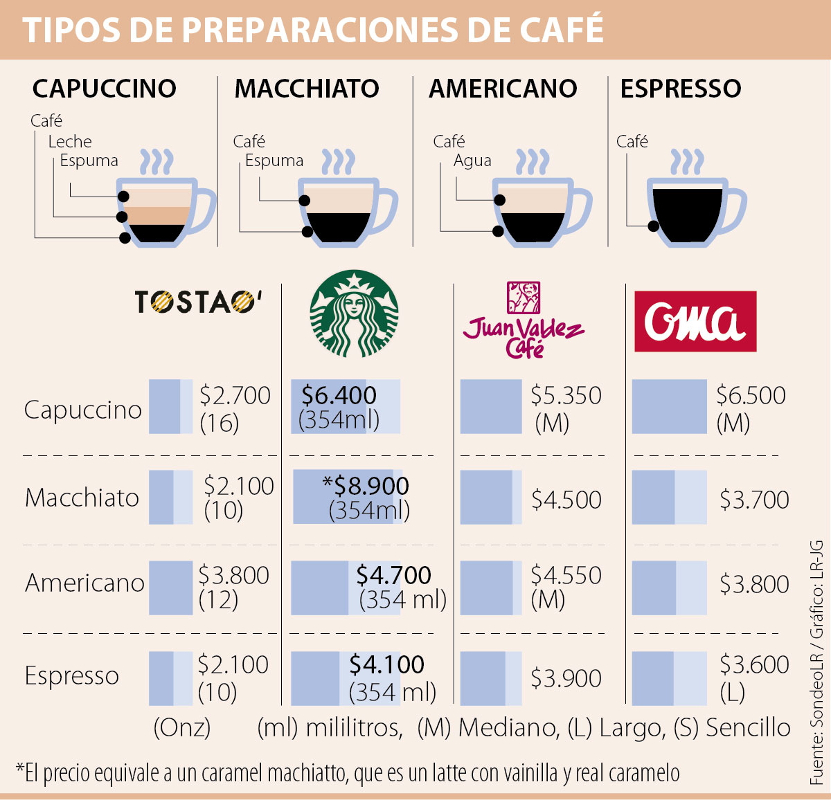 Puede encontrar el capuccino en diferentes presentaciones y con un valor de $2.700 en Tostao (16 Onz), $6.400 en Starbukcs , $5.350 en Juan Valdez Café y $6.500 en OMA.