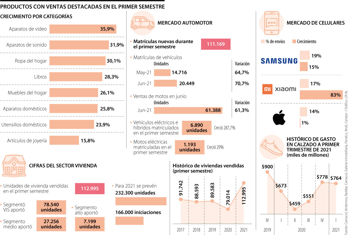 Uno de los bienes durables que más evidenció un comportamiento positivo fue la vivienda. Camacol y Coordenada Urbana registraron que, durante el primer semestre, se comercializaron 112.995 unidades, lo que significa un incremento de 43% más frente a lo registrado en 2020. En ese volumen récord, la Vivienda de Interés Social (VIS) aportó 78.540 unidades, mientras que los segmentos medio y alto registraron ventas por 27.256 y 7.199 unidades, respectivamente.