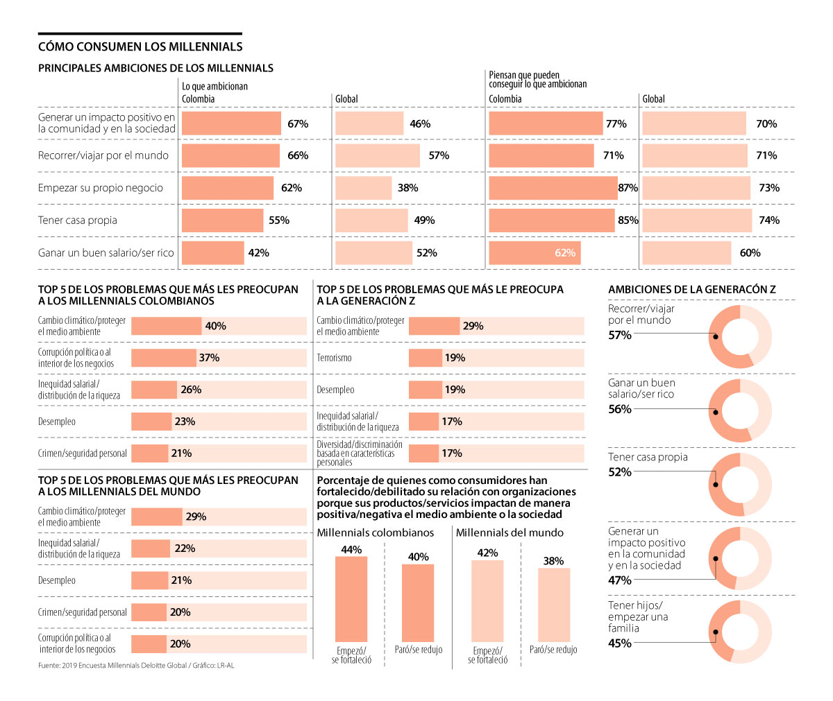 Esta es una de las conclusiones de la octava edición anual de la encuesta 2019 Millennial Survey de Deloitte, en la que participaron 13.416 millennials de 42 países y 3.009 personas de la generación Z de 10 países. De Colombia, solo participaron 301 millennials.